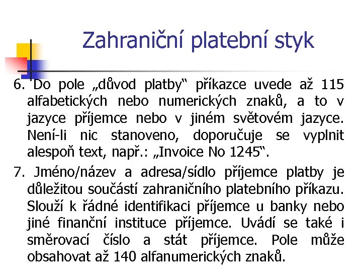 Zahraniční platební styk 6. Do pole „důvod platby“ příkazce uvede až 115 alfabetických nebo numerických znaků, a to v jazyce příjemce nebo v jiném světovém jazyce. Není-li nic stanoveno, doporučuje se vyplnit alespoň text, např. : „Invoice No 1245“. 7. Jméno/název a adresa/sídlo příjemce platby je důležitou součástí zahraničního platebního příkazu. Slouží k řádné identifikaci příjemce u banky nebo jiné finanční instituce příjemce. Uvádí se také i směrovací číslo a stát příjemce. Pole může obsahovat až 140 alfanumerických znaků.