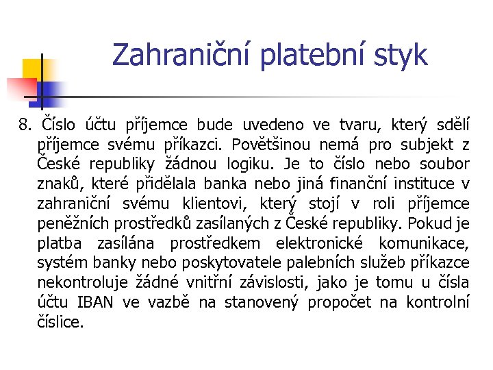 Zahraniční platební styk 8. Číslo účtu příjemce bude uvedeno ve tvaru, který sdělí příjemce svému příkazci. Povětšinou nemá pro subjekt z České republiky žádnou logiku. Je to číslo nebo soubor znaků, které přidělala banka nebo jiná finanční instituce v zahraniční svému klientovi, který stojí v roli příjemce peněžních prostředků zasílaných z České republiky. Pokud je platba zasílána prostředkem elektronické komunikace, systém banky nebo poskytovatele palebních služeb příkazce nekontroluje žádné vnitřní závislosti, jako je tomu u čísla účtu IBAN ve vazbě na stanovený propočet na kontrolní číslice.