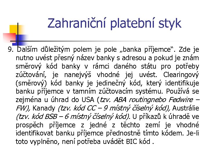 Zahraniční platební styk 9. Dalším důležitým polem je pole „banka příjemce“. Zde je nutno uvést přesný název banky s adresou a pokud je znám směrový kód banky v rámci daného státu pro potřeby zúčtování, je nanejvýš vhodné jej uvést. Clearingový (směrový) kód banky je jedinečný kód, který identifikuje banku příjemce v tamním zúčtovacím systému. Používá se zejména u úhrad do USA (tzv. ABA routingnebo Fedwire – FW), Kanady (tzv. kód CC – 9 místný číselný kód), Austrálie (tzv. kód BSB – 6 místný číselný kód). U příkazů k úhradě ve prospěch příjemce z jedné z těchto zemí je vhodné identifikovat banku příjemce přednostně tímto kódem. Je-li toto vyplněno, není potřeba uvádět BIC kód.