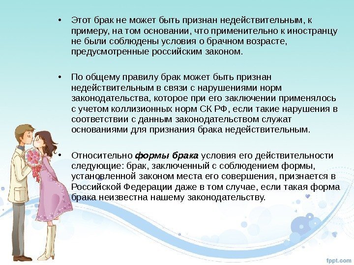 • Этот брак не может быть признан недействительным, к примеру, на том основании, что применительно к иностранцу не были соблюдены условия о брачном возрасте, предусмотренные российским законом. • По общему правилу брак может быть признан недействительным в связи с нарушениями норм законодательства, которое при его заключении применялось с учетом коллизионных норм СК РФ, если такие нарушения в соответствии с данным законодательством служат основаниями для признания брака недействительным. • Относительно формы брака условия его действительности следующие: брак, заключенный с соблюдением формы, установленной законом места его совершения, признается в Российской Федерации даже в том случае, если такая форма брака неизвестна нашему законодательству.