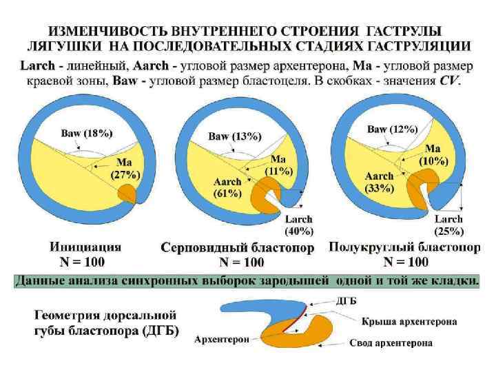 Морфометрия, топология и морфогенез дорсальной губы бластопора гаструлы (ДГБ или DBL), образующей арку над желточной энтодермой Основные метрические признаки, которые можно измерить снаружи после оформления ДГБ: Harc – высота (кривизна), Larc – линейная длина, Aarc – угловая длина ДГБ По своей топологии арка ДГБ является фрагментом тора, «дырой» которого является желточная пробка гаструлы: сплошные линии – долготы, пунктирные линии – широты тора В ходе морфогенеза ДГБ клетки движутся в гастральное впячивание по траекториям, форма которых изменяется в процессе движения клеток (GI – гастральное впячивание)