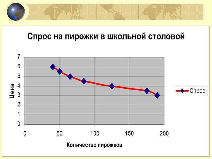 Шкала спроса на пирожки в школьной столовой Цена за пирожок, руб. 3. 00 3. 50 4. 00 4. 50 5. 00 5. 50 6. 00 Спрос, шт. 190 175 125 85 65 50 40