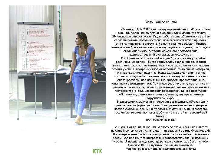 Законченное начало Сегодня, 01. 07. 2012 наш международный центр «Консалтинга, Тренинга, Коучинга» выпустил ещё одну замечательную группу обучающихся специалистов. Люди, работающие абсолютно в разных отраслях сумели довольно тесно познакомиться друг с другом и, конечно, получить невероятный опыт и знания в области бизнескоммуникаций, всевозможных манипуляций и создания, с помощью эмоционального контроля, семейного благополучия, взаимоотношений с окружающим социумом. Их обучение состояло из 4 модулей , которые несут в себе различный характер. Группа занималась с лучшими спикерами нашего центра, которые выкладывали все свои знания на «полочки свежих умов» . В программу входил не только лекционный материал, но и неотъемлемая практика. Наша целевая аудитория- группа, которая впоследствии превратилась в команду, что немало важно, адаптировалась под все виды тренажеров, предоставленные опытными руководителями. Принимая участие в них, мы, как и сами участники, выявили ряд новых и уникальных вещей, нужных как для построения бизнеса, управления персоналом, так и в воспитании собственных, личностных качеств, закалку лидера в семье и окружающем мире. В завершении, выпускники получили сертификаты об окончании тренингов и информацию о новом направлении нашего центра – модуле «Эмоциональный интеллект» . Участники были в восторге, грозились непременно начать обучение и в этой интереснейшей области. ПОПРОБУЙТЕ И ВЫ! «В День Рождения, я ходила на оперу со своим мужчиной. В этот приятный вечер случился инцидент, вызвавший во мне бурю эмоций. Но теперь я умею себя контролировать. Базовая часть, полученная здесь, научила меня фильтровать и сопоставлять свои импульсы и чувства. Я нашла выход там, где раньше столкнулась бы с тупиком. Спасибо КТК за нужные, полученные знания» . Марина, руководитель консалтингового агентства