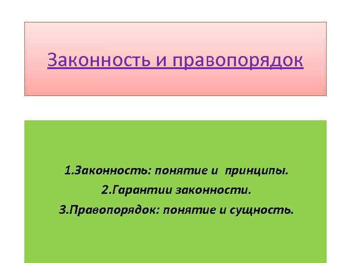 Законность и правопорядок 1. Законность: понятие и принципы. 2. Гарантии законности. 3. Правопорядок: понятие и сущность.