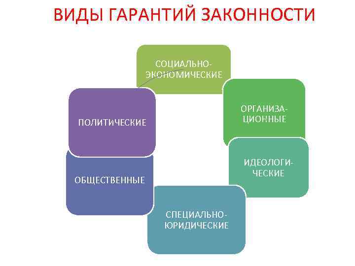 ВИДЫ ГАРАНТИЙ ЗАКОННОСТИ СОЦИАЛЬНО- ЭКОНОМИЧЕСКИЕ ОРГАНИЗА- ПОЛИТИЧЕСКИЕ ЦИОННЫЕ ИДЕОЛОГИ- ЧЕСКИЕ ОБЩЕСТВЕННЫЕ СПЕЦИАЛЬНО- ЮРИДИЧЕСКИЕ