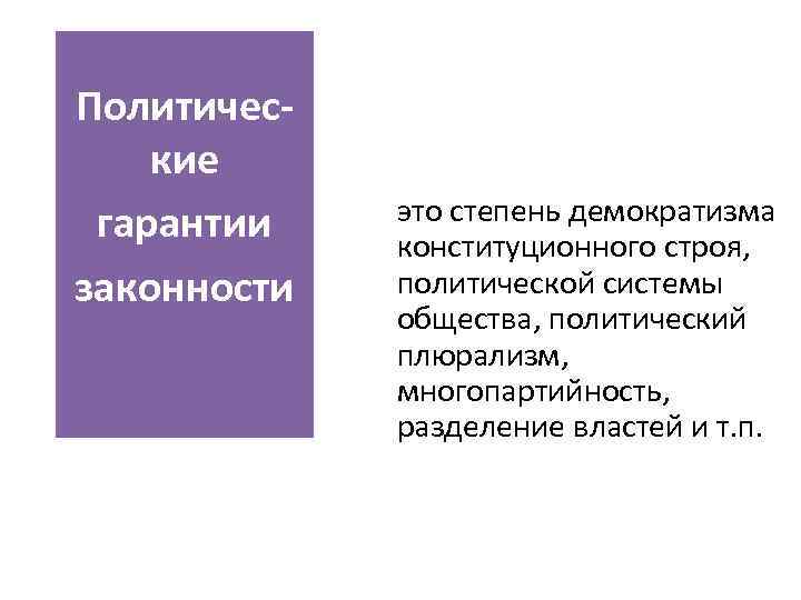Политичес- кие гарантии это степень демократизма конституционного строя, законности политической системы общества, политический плюрализм, многопартийность, разделение властей и т. п.