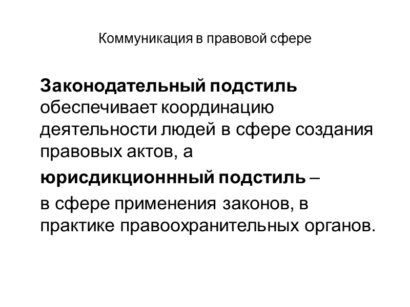 Коммуникация в правовой сфере Законодательный подстиль обеспечивает координацию деятельности людей в сфере создания правовых актов, а юрисдикционнный подстиль – в сфере применения законов, в практике правоохранительных органов.