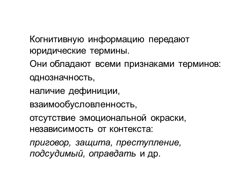 Когнитивную информацию передают юридические термины. Они обладают всеми признаками терминов: однозначность, наличие дефиниции, взаимообусловленность, отсутствие эмоциональной окраски, независимость от контекста: приговор, защита, преступление, подсудимый, оправдать и др.