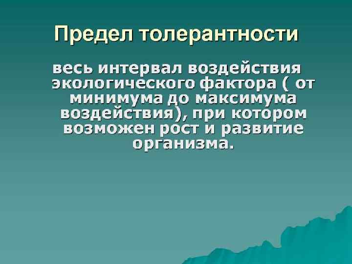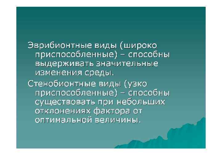 Абиотические факторы Абиотическое содержание среды определяется климатическими, почвенными и водными условиями. Классификация биотических факторов среды: • физические (температура, свет, влажность, барометрическое давление), • химические (состав атмосферы, органические и минеральные вещества почвы, р. Н почвы и др. ) • механические факторы (рельеф местности, движения почвы и воды, ветер, оползни и др. ). Диапазоны переносимости организмов (растений и животных) бывают эврибиотные (в широких пределах) и стенобионтные (в узких пределах).