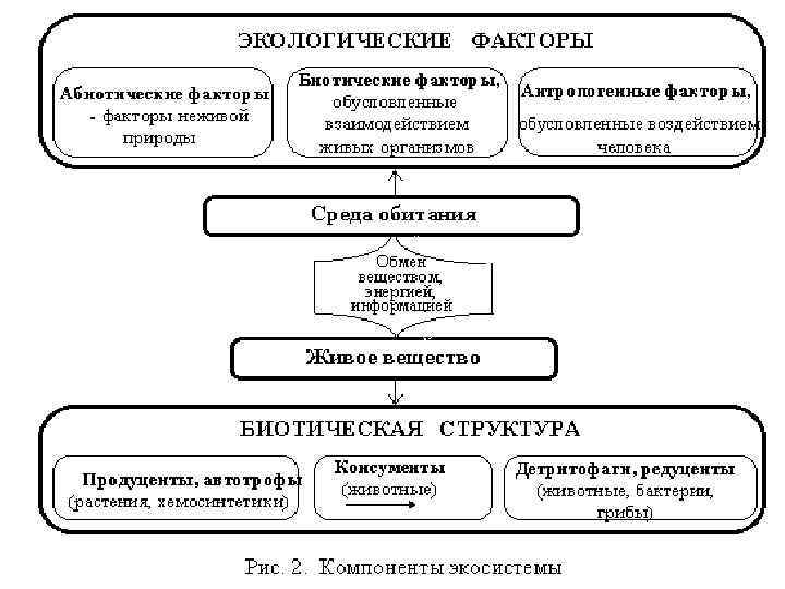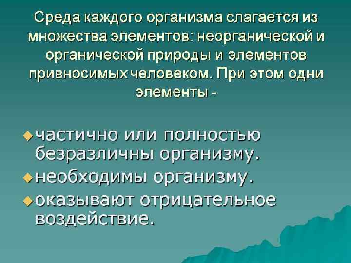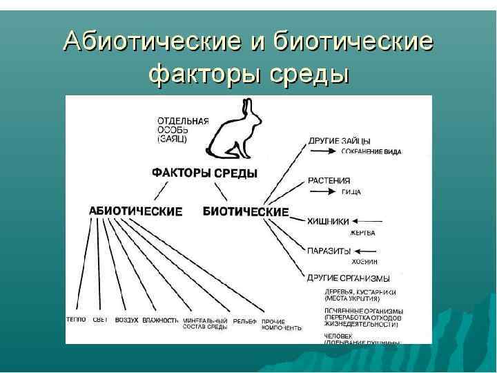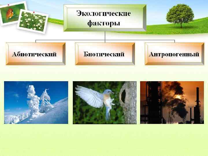 Окружающая среда - пространство, в котором живут организмы, и все то, что их окружает в этом пространстве. Территория, на которой располагаются организмы, есть среда их обитания. Различают следующие факторы среды: • Абиотические - факторы неживой природы. • Биотические - живые организмы растительной и животной природы. • Антропогенные - факторы, возникающие в результате деятельности человека.