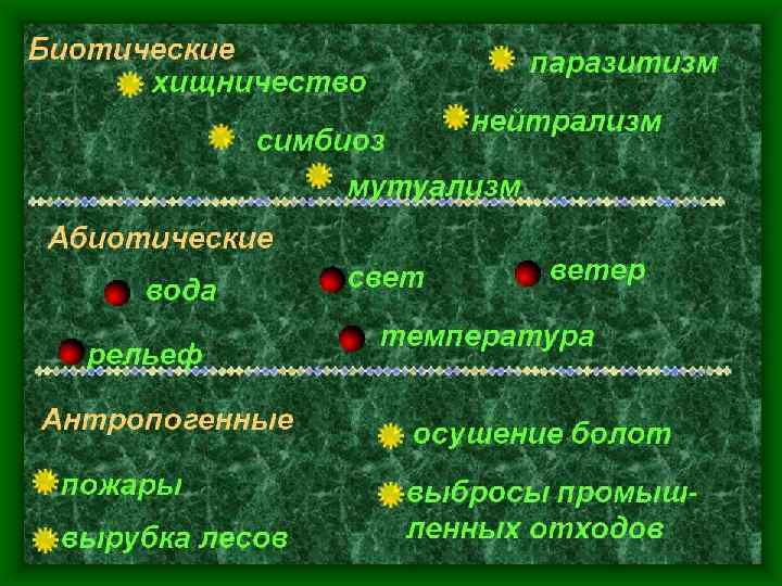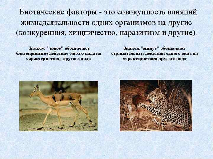 Биотические факторы Все организмы испытывают влияние среды и сами влияют на нее. Биотические факторы различаются на • фитогенные (фотосинтез - определяют газовый состав атмосферы); • зоогенные (изменяют газовый состав в атмосферы, в почве оказывают влияние на ее механический состав, между организмами в форме: симбиоза (мутуализма, комменсализма, хищничества, паразитизма), конкуренции и антагонизма.