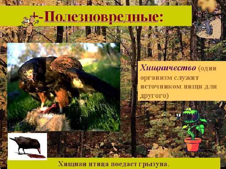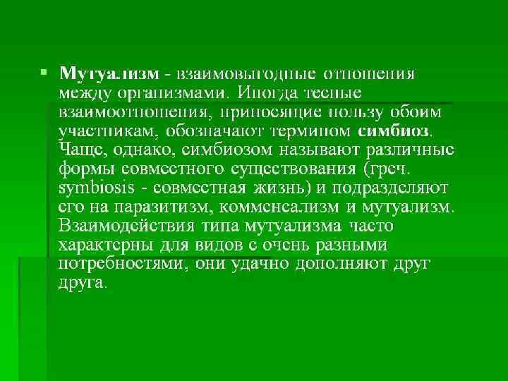 • Паразитизм (дефинитивные и промежуточные) - это когда один организм (паразит) живет за счет другого (хозяина), но не убивая его, а только вызывают болезнь хозяина. Дефинитивные, т. е. паразит приобретает половую зрелость организме хозяина; Промежуточные, т. е. паразит в организме хозяина проходит лишь некоторые стадии своего развития.