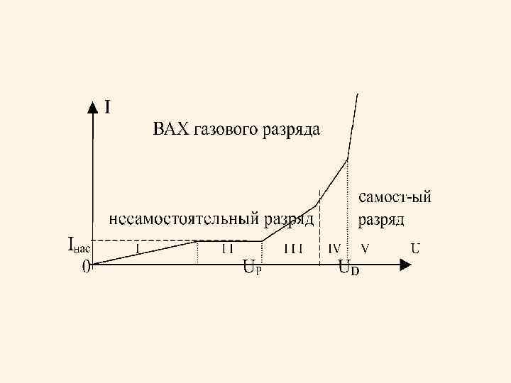 На ВАХ электрического разряда в газе можно выделить следующие 5 участков: область справедливости закона Ома: имеет место баланс между числом образуемых ионизатором носителей тока и их убылью за счет рекомбинации и ухода на электроды. Здесь по мере роста напряжения ток растет за счет увеличения числа носителей при рассасывании электронно ионного облака, образуемого ионизатором (имеет место ток, ограниченный пространствен ным зарядом). область насыщения тока. Здесь все образуемые внешним источником (ионизатором) носители тока попадают на электроды. Сила тока не зависит от напряжения, а определяется лишь мощностью ионизатора: нас = 2 qe Sl (jнас = 2 qe l), где число пар носителей, образуемых в единице объема в единицу времени, а l –
