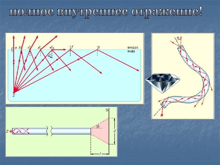 Показатели преломления некоторых веществ Стекло n = 1, 52 Спирт n = 1, 36 Алмаз n = 2, 42 Глицерин n = 1, 47 Скипидар n = 1, 5 Воздух n = 1, 0003