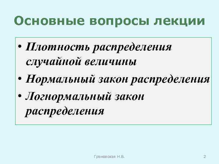 Основные вопросы лекции • Плотность распределения случайной величины • Нормальный закон распределения • Логнормальный закон распределения Грановская Н. В. 2