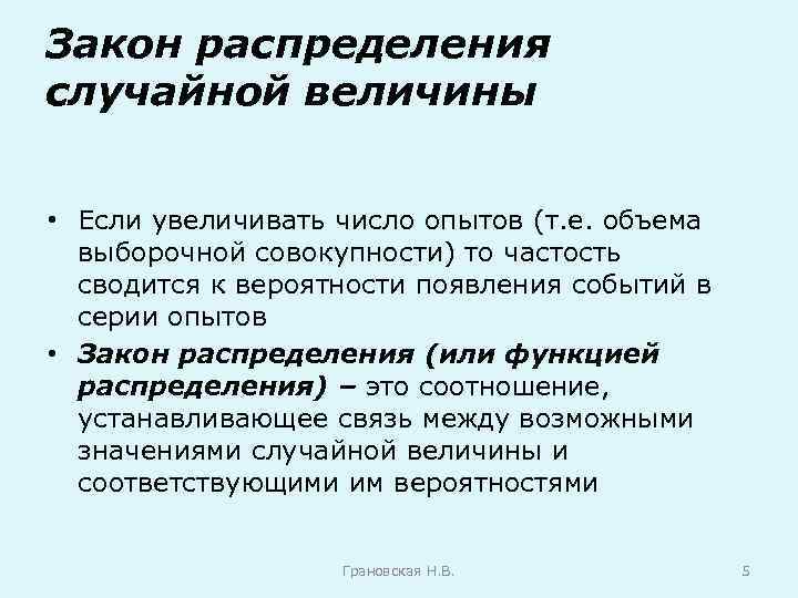 Закон распределения случайной величины • Если увеличивать число опытов (т. е. объема выборочной совокупности) то частость сводится к вероятности появления событий в серии опытов • Закон распределения (или функцией распределения) – это соотношение, устанавливающее связь между возможными значениями случайной величины и соответствующими им вероятностями Грановская Н. В. 5