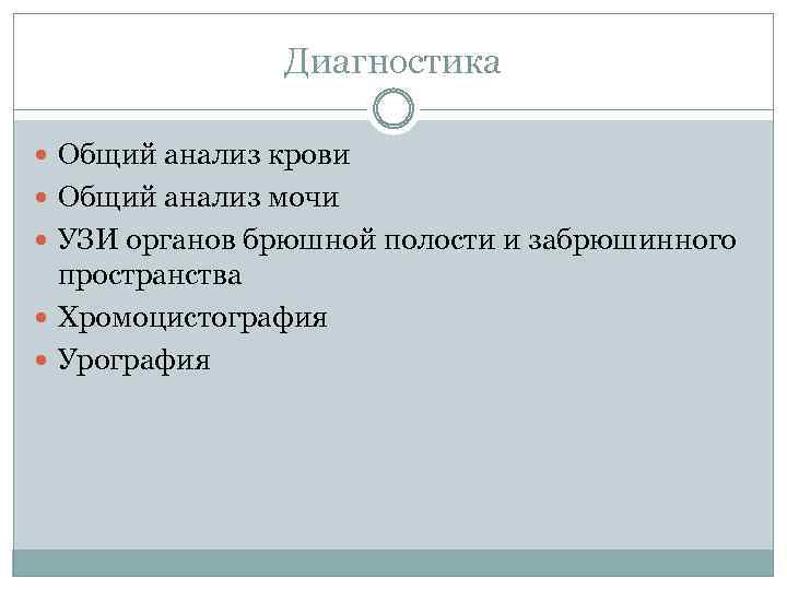 Диагностика Общий анализ крови Общий анализ мочи УЗИ органов брюшной полости и забрюшинного пространства Хромоцистография Урография