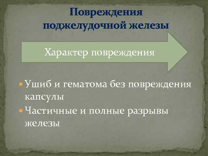 Повреждения поджелудочной железы Характер повреждения Ушиб и гематома без повреждения капсулы Частичные и полные разрывы железы