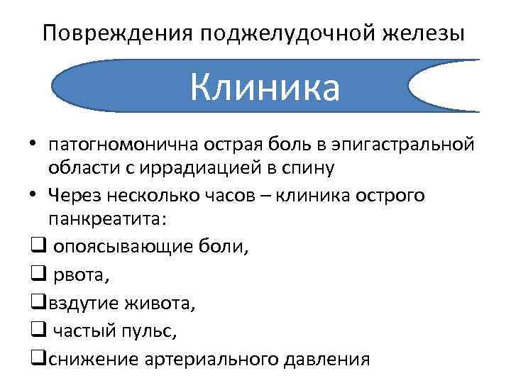 Повреждения поджелудочной железы Клиника • патогномонична острая боль в эпигастральной области с иррадиацией в спину • Через несколько часов – клиника острого панкреатита: q опоясывающие боли, q рвота, qвздутие живота, q частый пульс, qснижение артериального давления