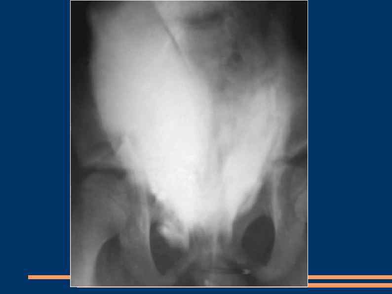 Внутрибрюшинный разрыв мочевого пузыря Гематурия В надлобковой области может определяться инфильтрат Клиника перитонита Тяжелая итоксикация Диагностика: ретроградная цистография Лечение: нижняя лапаротомия, аспирация мочи и крови из брюшной полости, ушивание стенки двухрядным швом, не захватывая в швы слизистую оболочку (наличие лигатур в просвете мочевого пузыря ведет к формированию конкрементов). Дренирование мочевого пузыря