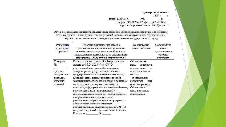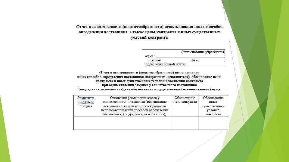 - В случае осуществления закупки у единственного поставщика для заключения контракта заказчик обязан обосновать в документально оформленном отчете невозможность или нецелесообразность использования иных способов определения а также цену контракта и иные существенные условия контракта.