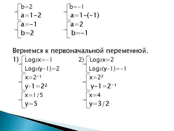 b=2 a=1 -2 a=-1 b=2 b=-1 a=1 -(-1) a=2 b=-1 Вернемся к первоначальной переменной. 1) Log₂x=-1 2) Log₂x=2 Log₂(y-1)=-1 y⋅1=2² y-1=2⁻¹ x=1/5 y=5 x=2² x=4 y=3/2