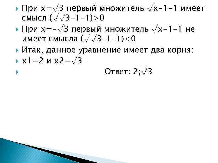 При x=√ 3 первый множитель √x-1 -1 имеет смысл (√√ 3 -1 -1)>0 При х=-√ 3 первый множитель √x-1 -1 не имеет смысла (√√ 3 -1 -1)<0 Итак, данное уравнение имеет два корня: x 1=2 и x 2=√ 3 Ответ: 2; √ 3
