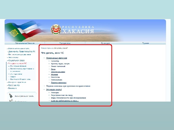 Информация о состоянии защиты населения и территорий от чрезвычайных ситуаций Прогноз возникновения чрезвычайных ситуаций Анонс предпринятых мер по обеспечению безопасности в случае чрезвычайной ситуации (статистика чрезвычайных ситуаций на территории субъекта) Рекомендации по приемам и способам защиты населения Перечень и тексты нормативных правовых актов, определяющих организационно-правовые нормы в области защиты граждан Российской Федерации от чрезвычайных ситуаций природного и техногенного характера.