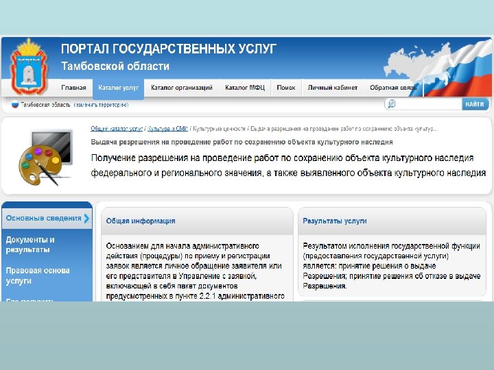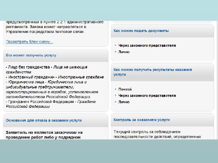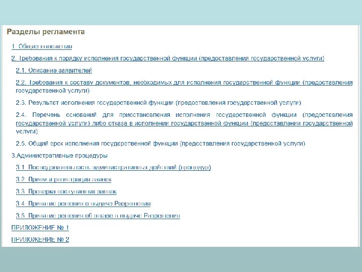 Общие положения • а) наименование государственной функции (государственной услуги); • б) наименование органа исполнительной власти, непосредственно исполняющего государственную функцию (предоставляющего государственную услугу). • в) перечень нормативных правовых актов • г) описание результатов исполнения государственной функции (предоставления государственной услуги), а также указание на юридические факты, которыми заканчивается исполнение государственной функции (предоставление государственной услуги); • д) описание заявителей, а также физических и юридических лиц, имеющих право выступать от их имени при исполнении государственной функции (предоставлении государственной услуги).