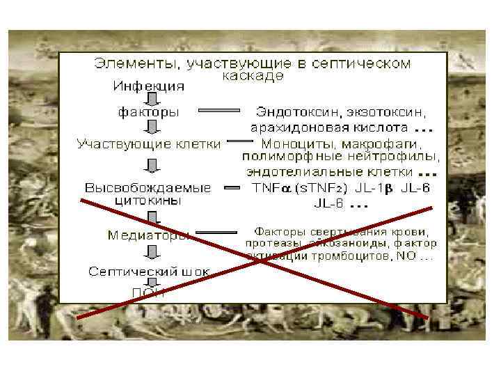 Лечебные мероприятия при синдроме острого воспаления Инфекция Операция Антибиотики Эндотоксин Адсорбция эндотоксина Моноциты / макрофаги Стероиды Ингибиторы протеаз Цитокины Гемо /диафильтрация SIRS CARS Эндотелиальные клетки ПОН Нормализация метаболизма кислорода в тканях Замещение утраченных функций в т. ч. Гемо /диафильтрация