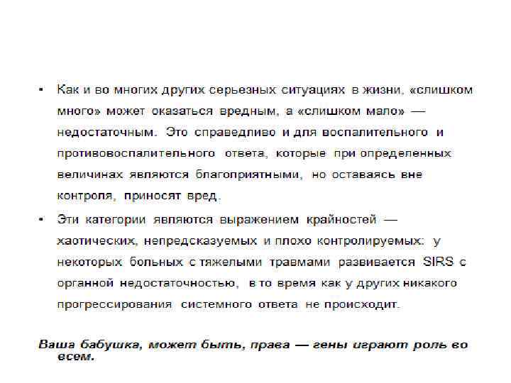 • Как и во многих других серьезных ситуациях в жизни, «слишком много» может оказаться вредным, а «слишком мало» — недостаточным. Это справедливо и для воспалительного и противовоспалительного ответа, которые при определенных величинах являются благоприятными, но оставаясь вне контроля, приносят вред. • Эти категории являются выражением крайностей — хаотических, непредсказуемых и плохо контролируемых: у некоторых больных с тяжелыми травмами развивается SIRS с органной недостаточностью, в то время как у других никакого прогрессирования системного ответа не происходит. Ваша бабушка, может быть, права — гены играют роль во всем.
