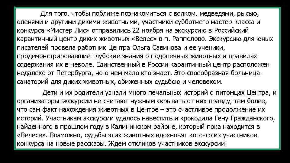 Для того, чтобы поближе познакомиться с волком, медведями, рысью, оленями и другими дикими животными, участники субботнего мастер-класса и конкурса «Мистер Лис» отправились 22 ноября на экскурсию в Российский карантинный центр диких животных «Велес» в п. Рапполово. Экскурсию для юных писателей провела работник Центра Ольга Савинова и ее ученики, продемонстрировавшие глубокие знания о подопечных животных и правилах содержания их в неволе. Единственный в России карантинный центр расположен недалеко от Петербурга, но о нем мало кто знает. Это своеобразная больницасанаторий для диких животных, обиженных судьбою и человеком. Дети и их родители узнали много печальных историй о питомцах Центра, и организаторы экскурсии не считают нужным скрывать от них правду, тем более, что сам факт нахождения животных в Центре – это счастливое продолжение их историй. Участникам экскурсии удалось навестить и крокодила Гену Гражданского, найденного в прошлом году в Калининском районе, который пока находится в «Велесе» . Возможно, судьбы этих животных вдохновят кого-то из участников конкурса на новые рассказы. Ждем откликов участников экскурсии!