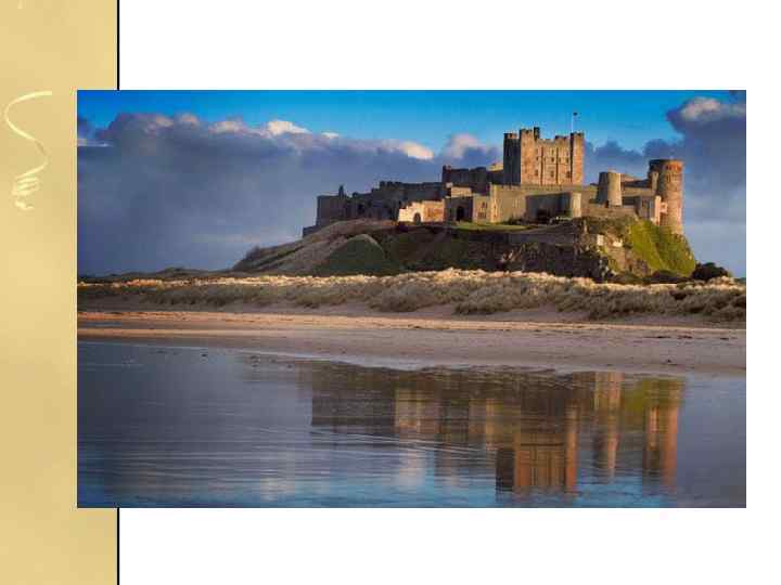 замок Бамбурга • З'являється в безлічі фільмів від Єлизавети (1988) до Робін Гуда (2010), замок Бамбурга підноситься з скелястих берегів Бамбурга, графства Нортумберленд. Історик та телеведучий Ден Сноу називає його вид «неймовірно сильним і вражаючим» .