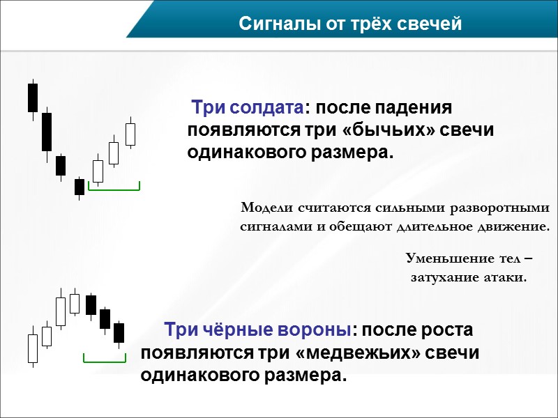 Три солдата: после падения появляются три «бычьих» свечи одинакового размера. Сигналы от трёх свечей Три чёрные вороны: после роста появляются три «медвежьих» свечи одинакового размера. Модели считаются сильными разворотными сигналами и обещают длительное движение. Уменьшение тел – затухание атаки.