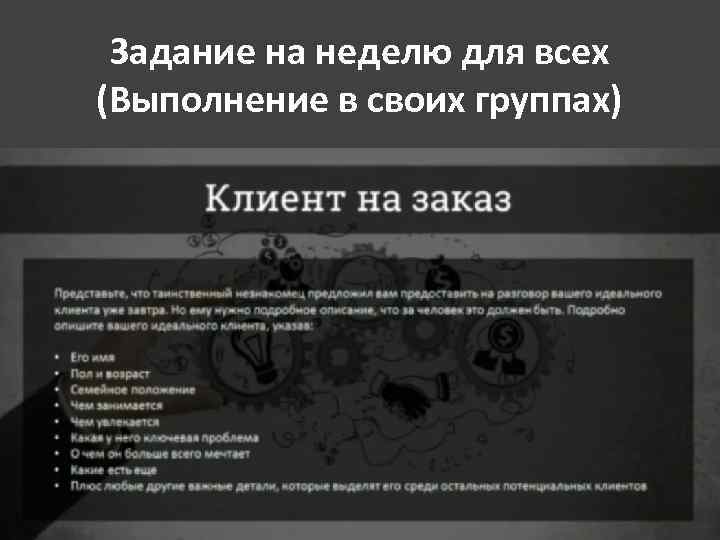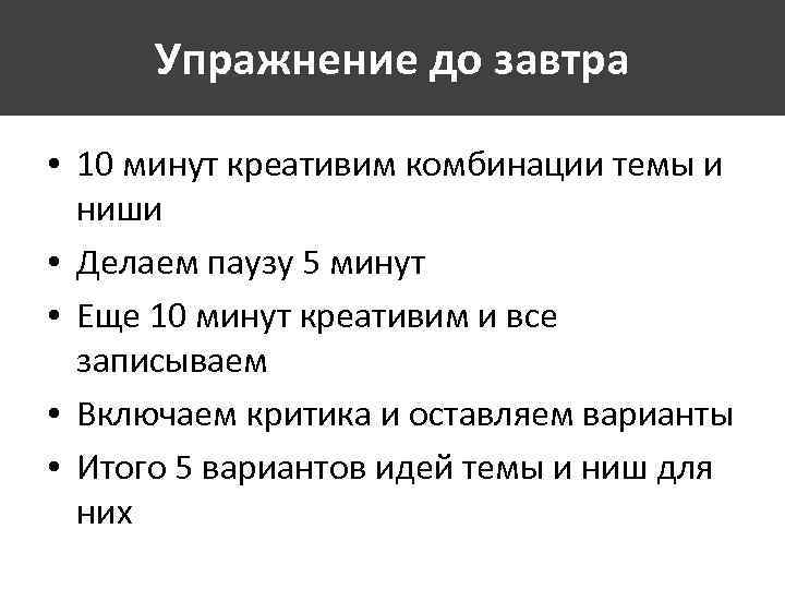 Упражнение до завтра • 10 минут креативим комбинации темы и ниши • Делаем паузу 5 минут • Еще 10 минут креативим и все записываем • Включаем критика и оставляем варианты • Итого 5 вариантов идей темы и ниш для них