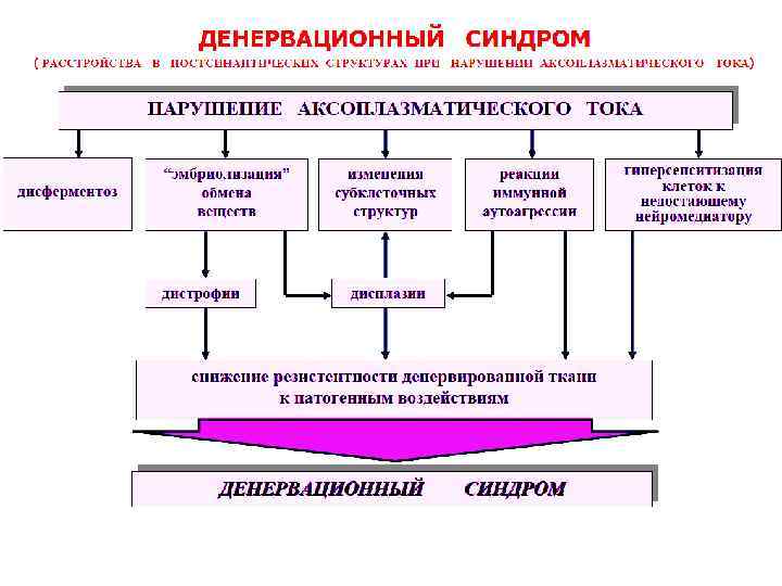 Денервационный синдром – комплекс изменений возникающих в постсинаптических нейронах органах и тканях в связи с выпадением нервных влияний на эти структуры. Причины – перерывание нерва, многие формы патологии, влияние фармсредств, нарушающих нервные влияния, блокада нейрорецепторов Изменения в тканях после денервации Растормаживание денервированных структур Полное или частичное выпадение функции Частичная дедифференцировка Образование аутоантигенов Повышение чувствительности денервированных структур к нейромедиаторам В мышце – исчезновение концевой пластинки на мышечном волокне, где сосредоточен холинергический аппарат с повышением чувствительности волокна к ацетилхолину, фибриллярные подергивания