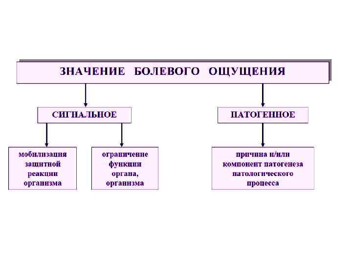 Боль • Боль — особый вид чувствительности, формирующийся под действием патогенного раздражителя, характеризующийся субъективно неприятными ощущениями, а также существенными изменениями в организме, вплоть до серьёзных нарушений его жизнедеятельности и даже смерти. • Боль может иметь сигнальное и патогенное значение.