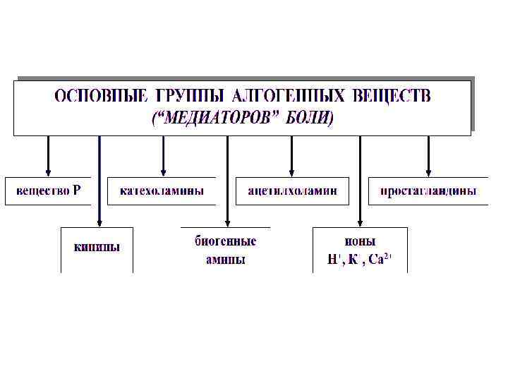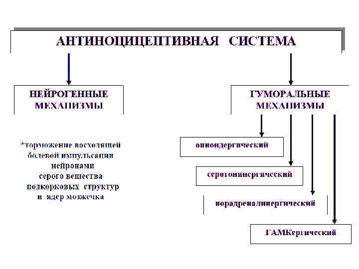 принципы лечения боли: 1 Уменьшение болевой афферентации: а) уменьшение возбуждения рецепторов б) увеличение порога болевой чувствительности в) нарушение проведения импульсов от рецепторов по нервным проводникам. 2 Модуляция сенсорных входов. При увеличении импульсации по толстым нервным волокнам уменьшается болевая афферентация. Этот принцип лежит в основе физических методов обезболивания. 3 Активация эндогенных антиноцицептивных систем или имитирование их действия введением фармакологических агонистов 4 Угнетение, разрушение или удаление центров патологической болевой импульсации в ЦНС. 5 Устранение психогенной болевой патологической доминанты.
