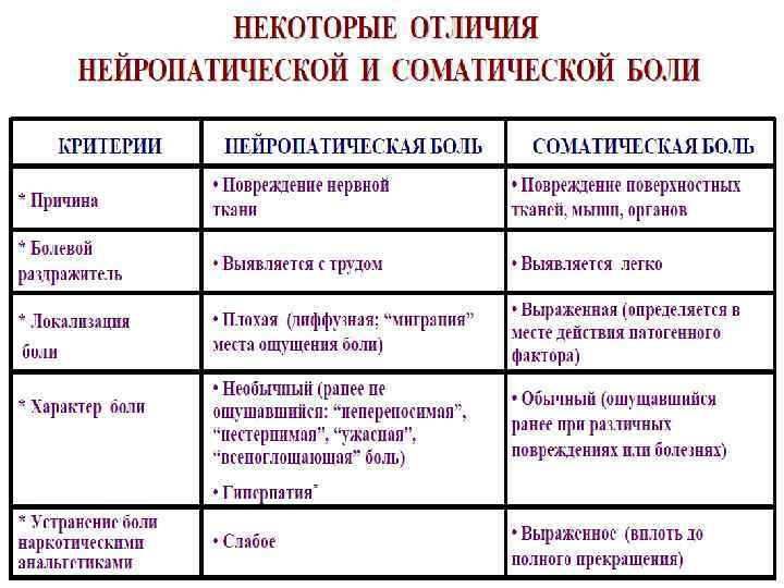 Работа № 2 Заполнить таблицу «Отличия нейропатической и соматической боли» Нейропатическая Соматическая боль Причина Болевой раздражитель Локализованность боли Характер боли Устранение боли наркотическими анальгетиками