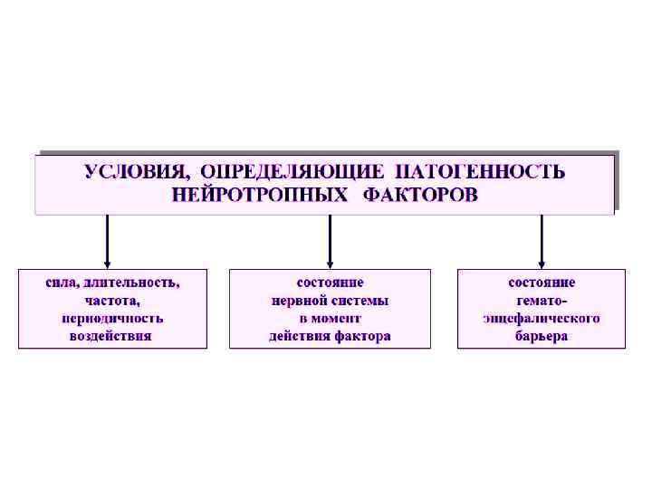 Экзогенные причины повреждений нервной системы Физические (травма, радиация, снижение или увеличение р02 во вдыхаемом воздухе) Биологические Химические (нейротропные (спирты; вирусы: ядохимикаты: бешенства, Психогенные ФОС; нервнополиомиелита, (психотравмиру паралитические герпеса; ющие ситуации, отравляющие микробы: устрашающие вещества; сифилис, лепра; образы, звуки, фармакологичес микробные ощущения) кие препараты токсины: центрального ботулинический, действия) дифтерийный, столбнячный).