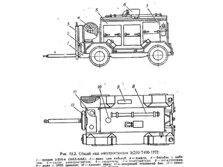 В состав электростанций входят: унифицированный бензиновый (дизельный) ЭА однофазного (трехфазного) тока напряжением 230 В, частотой 50 Гц; комплект осветительных средств; комплект кабельной сети; комплект запасных частей, инструмента и принадлежностей; комплект укладочных средств; прицеп (кузов фургон на автомобиле); комплект эксплуатационной документации. Источниками питания электростанций мощностью 0, 5, 2 и 4 к. Вт являются бензиновые ЭА однофазного переменного тока на пряжением 230 В. Источниками питания электростанций мощ ностью 8 и 16 к. Вт являются автоматизированные по 1 степени многотопливные дизельные ЭА трехфазного тока с генераторами маховичного типа.