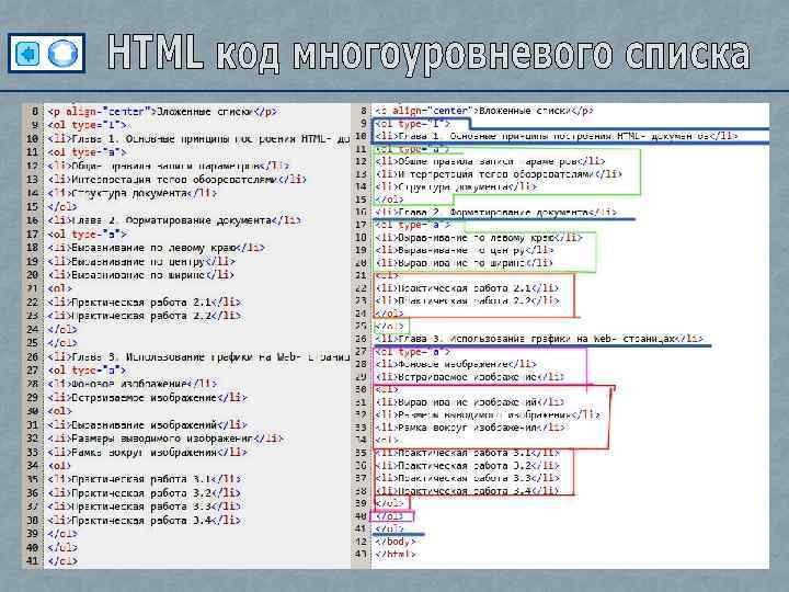 Многоуровневый список – это когда один список вкладывается в другой. И хотя в HTML его не выделяют бывает так, что он необходим. Для многоуровневого списка используются маркированные и нумерованные списки. посмотреть HTML код Задание: создайте свой многоуровневый список, заархивируйте и отправьте мне через Виртуальную школу
