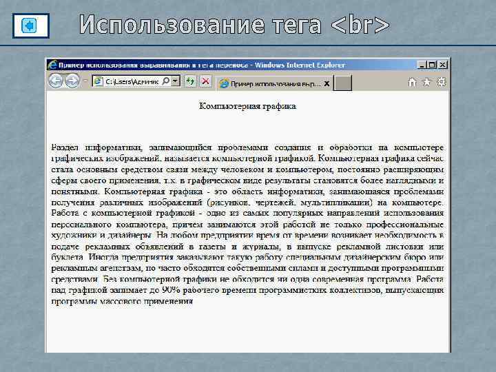 У атрибута align тега <p> значений несколько: <p align="center“>Этот текст будет расположен по центру</p> <p align= "left" >Этот текст будет расположен по левому краю</p> <p align= "right" >Этот текст будет расположен по правому краю</p> <p align= "justify" >Этот текст будет расположен по ширине</p> Задание: продолжаем редактировать статью, используя атрибут align произвести выравнивание в документе. 1. Главный заголовок выровнять по центру 2. Основные текстовые абзацы описание программ, выровнять по ширине 3. Все подзаголовки выровнять по левому краю