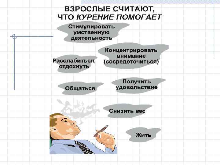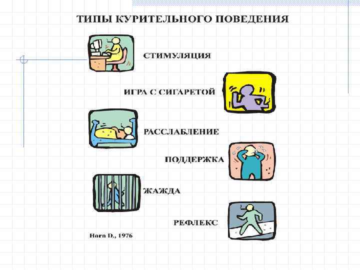 Типы курительного поведения: «Жажда» Физическая привязанность к табаку. Человек закуривает, когда снижается концентрация никотина в крови. Курит в любой ситуации, вопреки запретам.