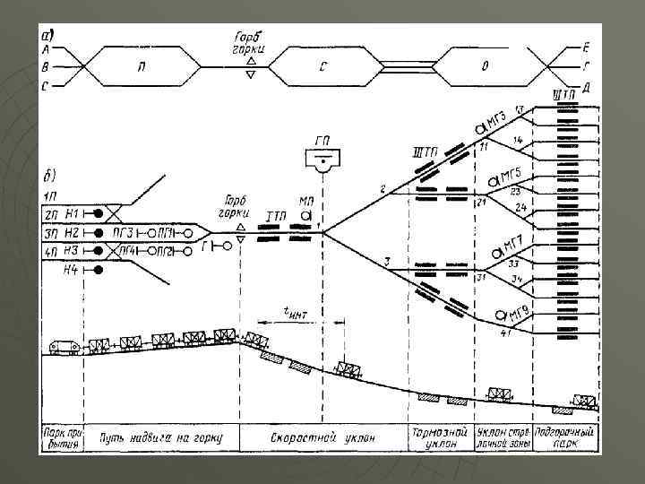 План 1. Призначення сортувальної станції. Технологічний процес розсортування вагонів на гірці. 2. Гальмівні позиції на гірці та їх призначення. 3. Розрахунок мінімально допустимого інтервалу між відчепами. 4. Системи автоматизації розформування составів на гірці. Д. З. Вивчити матеріал за літературою Л. 1 на ст. 332 -335 + конспект і додаткова література Л 3 ст. 4 -9.