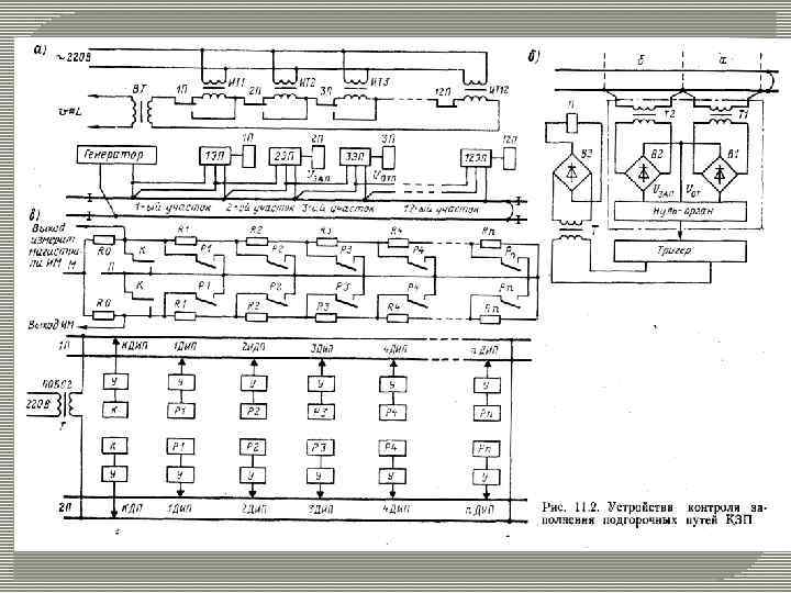 До складу ЗП (мал. 11. 2. б) входять вхідні що відмикає й замикають трансформатори ТІ, Т 2, випрямлячі В 1, В 2, нуль-орган, тригер, вихідний трансформатор Т випрямляч ВЗ, на виході якого включене колійне реле ГІ (НМШ 1 -2000).