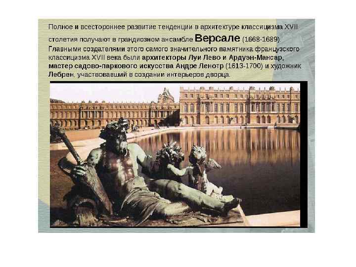 Версальский парк, созданный по проекту А. Ленотра: строгая симметрия аллей и прудов, ряды подстриженных цветников и деревьев, скульптуры античных богов и героев, изваяния царственных особ французского двора.