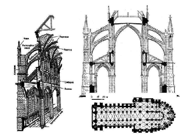 Основные черты готического стиля - аллегорический тип мышления, условность художественного языка; - архитектурная основа – базилика; - устремленность человека к небу выражается высоким шпилем и подчеркнутым вертикализмом формы; - на западном фасаде обязательны две башни (символ двойной природы Христа); - облегчение конструкции за счет каркаса; - стрельчатые арки; - обширные интерьеры с огромными прорезными окнами, украшенными многоцветными витражами; - обязательный элемент - витражное окно-роза – символ Христа; - пышный декор с использованием золотой краски, резьбы по дереву, резной и раскрашенной религиозной скульптуры; - органическая связь архитектуры и скульптуры за счет удлиненных пропорций