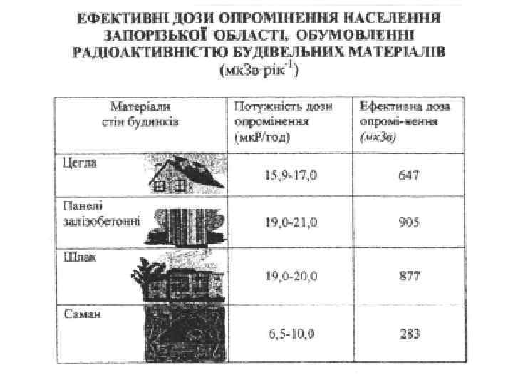 Основные источники облучения населения и обусловленные ими эффективные эквивалентные дозы Источники излучения Природные космические лучи на поверхности земли гамма излучение фоновое дополнительное (стройматериалы) внутреннее облучение бета излучатели альфа излучатели дополнительное удобрения сжигание угля радон 222, радон 220 фоновое дополнительное стройматериалы почва Медицинские рентгенодиагностика радионуклидная диагностика Остальные искусственные источники испытания ядерного оружия ядерная энергетика профессиональное облучение последствия аварии на ЧАЭС (1990) Всего. . . Доза, мк. Зв/год 320 300 110 200 160 0, 3 2 280 480 1090 1230 1200 30 53, 1 20 0, 1 3 30 4200