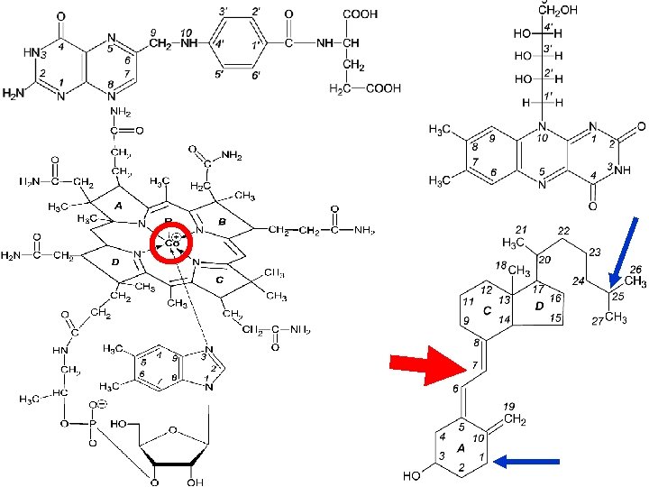 В 12 - кобаламин – антианемический Биологическая роль : - метил-В 12 совместно с ТГФК участвует в реакциях трансметилирования -дезоксиаденозил- В 12 - кофермент метилмалонил. Ко. Амутазы (катализирует превращение метилмалонил. Ко. А в сукцинил-Ко. А) Гиповитаминоз – мегалобластическая анемия, пернициозная анемия (болезнь Аддисона-Бирмера)